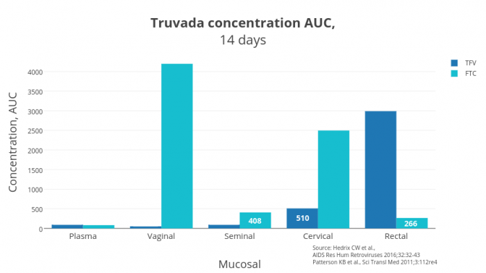 The graph (Figure 1) shows the difference between the AUC-concentrations of tenofovir and emtricitabine in the tissues. The AUC concentration or area under the concentration-time curve (AUC) is the area of the figure bounded by the pharmacokinetic curve of the drug concentration in the tissue at each time point and the coordinate axes. Thus, the numbers that you see on the chart are the total amount of the drug that was in the tissue for 14 days. The more the drug was in the organ’ mucous tissue for 14 days — the more protected from HIV the organ was.