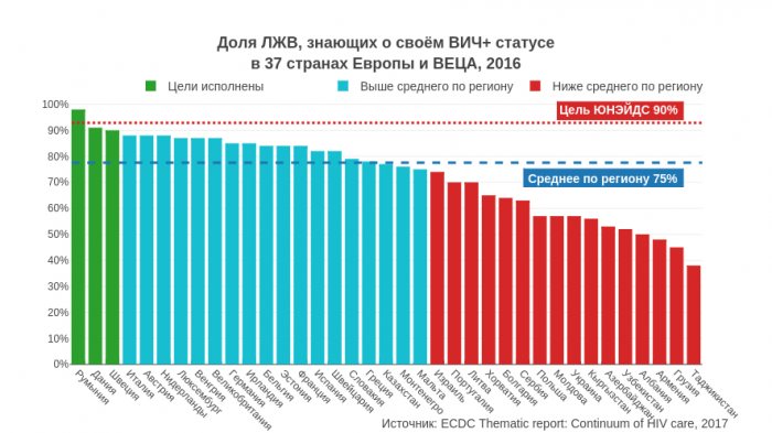 Рисунок 2 — Доля ЛЖВ, знающих о своём ВИЧ+ статусе в 37 странах Европы и ВЕЦА