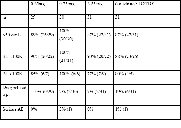 Представители разработчика представили на конференции сведения по фазе 2b рандомизированного двойного слепого плацебо-контролируемого исследования с диапазоном доз у пациентов, ранее не получавших лечения. Ученые проводили активный контроль MK-8591, используя комбинацию доравирин/ламивудин /тенофовир дизопроксил фумарат.