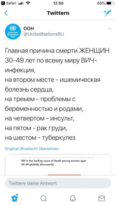 Среди основных причин смерти молодых женщин в возрасте от 30 до 49 лет лидирует ВИЧ-инфекция, следует из данных статистики ВОЗ за 2010 – 2015 гг., представленных сегодня ООН в официальном twitter-аккаунте организации.