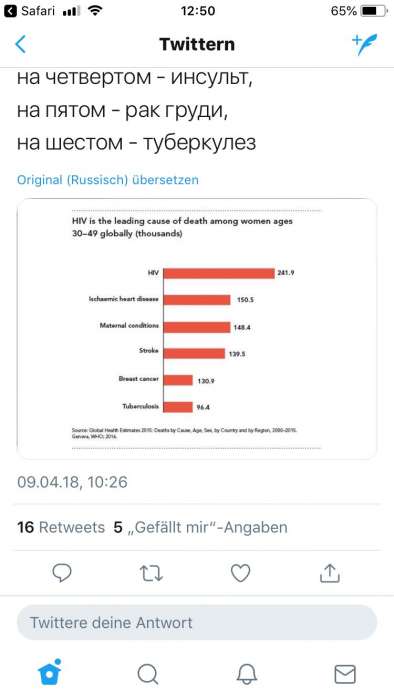 Число умерших от последствий ВИЧ женщин более чем в 1,6 раза опережает ишемическую болезнь сердца (241,9 тыс. против 150,5 тыс.), в 1,63 раза (148,4 тыс.) – осложнения при беременности и родах, в 1,73 раза (139,5 тыс.) – инсульт, в 1,85 раз (130,9 тыс.) – рак груди и более чем в 2,5 раза (96,4 тыс.) – туберкулез.