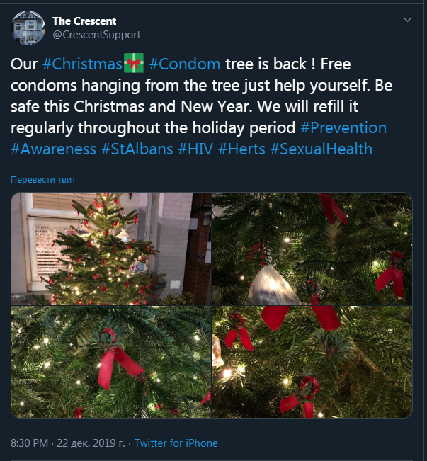 Как пояснили в Crescent, обычно люди могут в любое время прийти в центр и получить бесплатные презервативы, но в период Рождества у них, как  правило, нет на это времени, поэтому активисты приняли решение «наряжать» елку вплоть до двенадцатой ночи (5 января 2020 года).