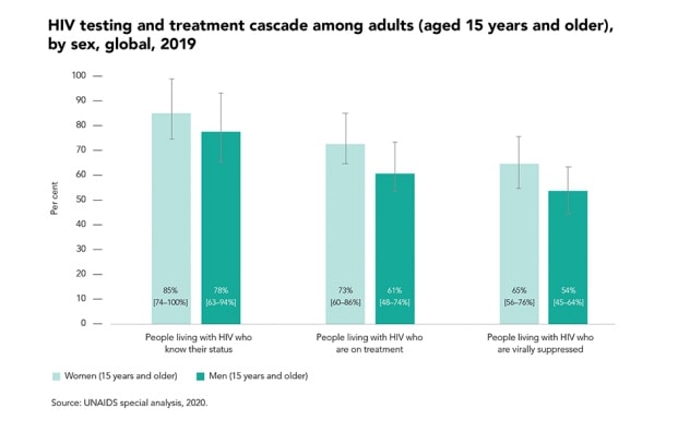 ЮНЭЙДС представила краткие данных по каскаду тестирования и лечения в связи с ВИЧ среди людей старше 15 лет, за 2019 год. Глобальная статистика указывает, что по всем пунктам каскада, включая прием антиретровирусной терапии и подавленную вирусную нагрузку, лидируют женщины.