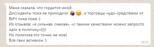К моменту выхода публикации мы спросили у Марины, как прошла их встреча с мамой, писали ли ей ВИЧ-отрицатели, и вообще, пишут ли ей люди в соцсетях?
