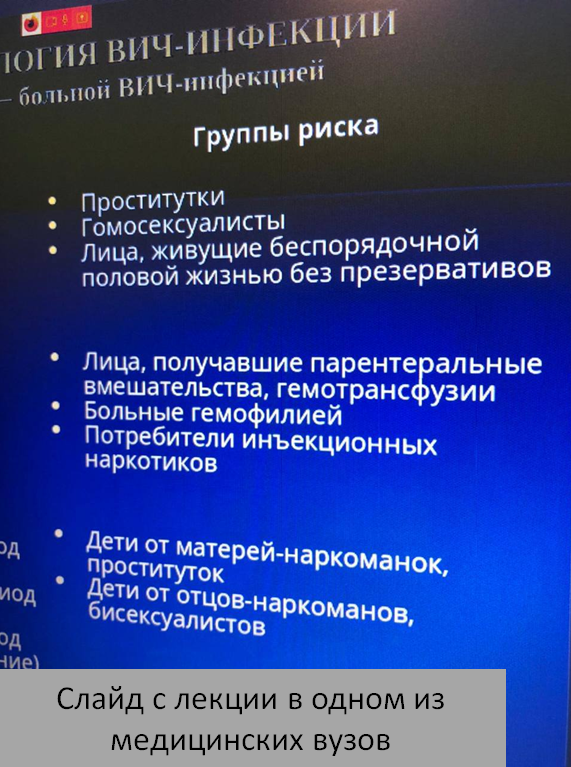 Потом я начала замечать все эти мифы среди однокурсников и поняла, что никто ничего не знает и не заинтересован узнать. Нам читали лекции каких-то лохматых годов, я даже сохранила слайд с одной из таких лекций, где очень своеобразно были описаны ключевые группы. И это нам рассказывал профессор кафедры инфекционных болезней.