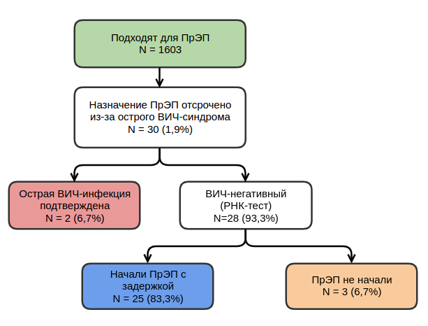 Какие основания были у команды доктора Круча для предложения раннего старта ПрЭП? Ответ найдём в исследовании iPrEx OLE за 2014 год. Учёные предложили предложить каждому обратившемуся за ПрЭП ответить на вопросы в анкете, которые позволили бы выявить острый ретровирусный синдром у респондентов. Как видно на диаграмме (рис. 1), в исследовании участвовало 1 603 человек. У 30 из них на основании ответов на вопросы выявили признаки острого ретровирусного синдрома, характерного для первых недель ВИЧ-инфекции. Таким людям предлагали сдать кровь для анализа не экспресс-тестом на ВИЧ, а затратным тестом ПЦР на РНК ВИЧ. У двух человек выявили острую фазу ВИЧ-инфекции. Среди оставшихся 28 испытуемых, 25 начали ПрЭП с задержкой, а три человека отказались от ПрЭП.