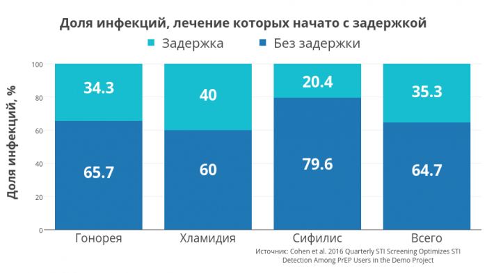 Рисунок 2 — Доля инфекций, лечение которых начато с задержкой вследствие проведения анализа 1 раз в 6 месяцев (с задержкой) вместо 1 раза в 3 месяца (без задержки). Источник: Cohen et al. 2016 Quarterly STI Screening Optimizes STI Detection Among PrEP Users in the Demo Project