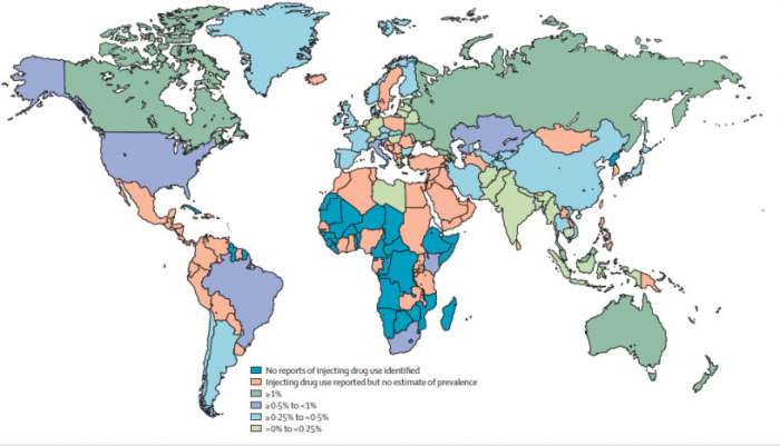 Рис. 1 — Доля потребителей инъекционных наркотиков (ПИН) среди всех жителей стран, источник— Mathers et al. Lancet 2008; 372: 1733