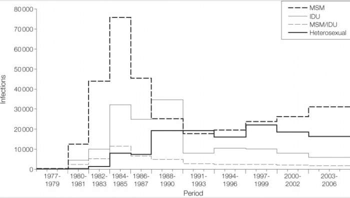 В следующем слайде (рис. 2) показаны оценки числа новых случаев ВИЧ в США по годам среди людей из разных групп риска. Пунктиром обозначены МСМ, как видно — в первые годы эпидемии ВИЧ/СПИДа число случаев среди МСМ росло драматически, также быстро начав снижение в конце 1980х. Как видно на графике, число случаев в этой группе стало расти в конце 00х годов.