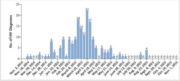 Рис. 3 — Всплеск новых случаев ВИЧ в Скотт Каунти, США, источник  — Peters PJ et al New Engl J Med 2016;375:229