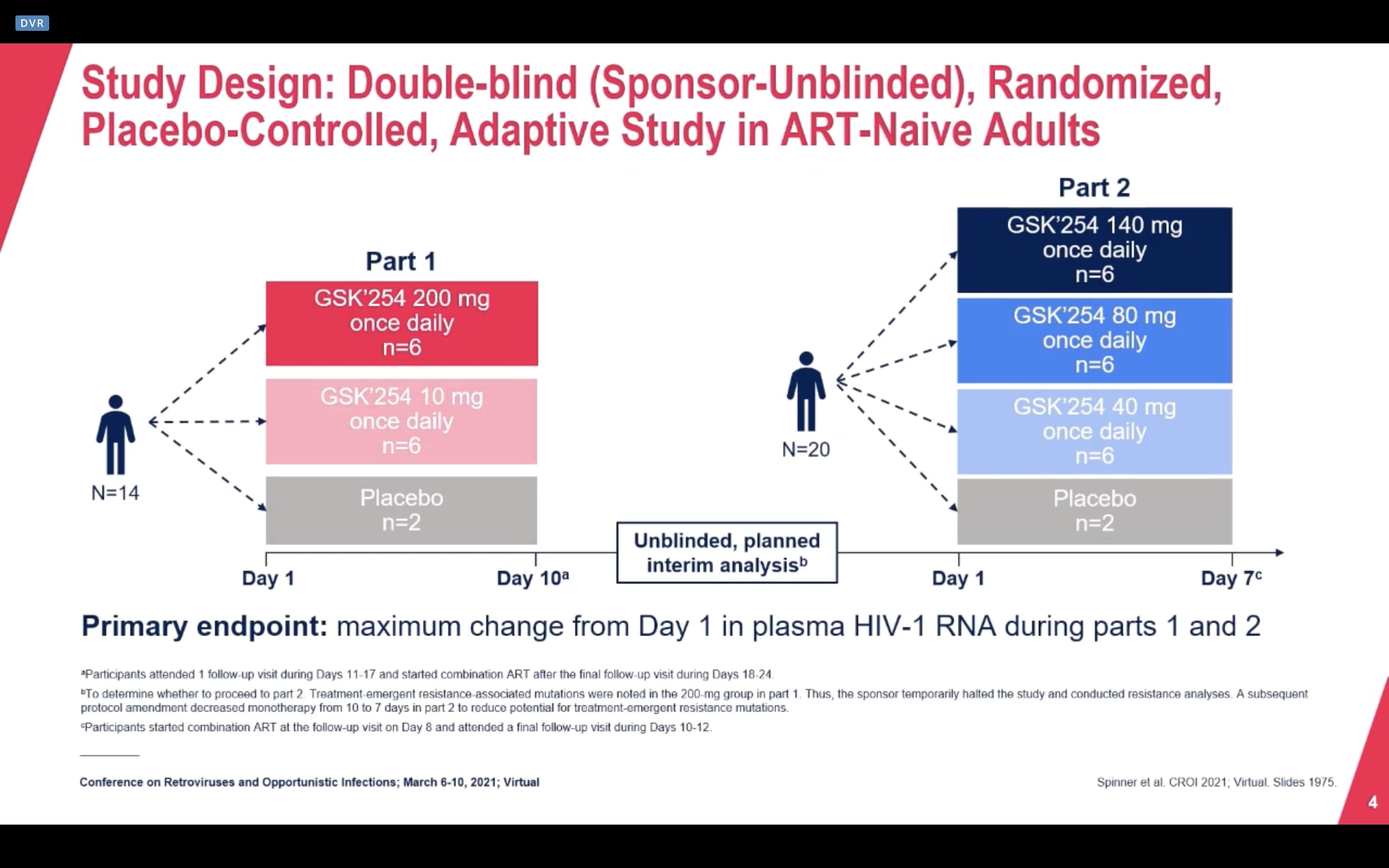 В процессе двойного, рандомизированного, плацебо-контролируемого слепого исследование фазы IIa ученые оценивали противовирусную эффективность, безопасность и переносимость препарата GSK'254 у взрослых, ранее не получавших лечения от ВИЧ-1.