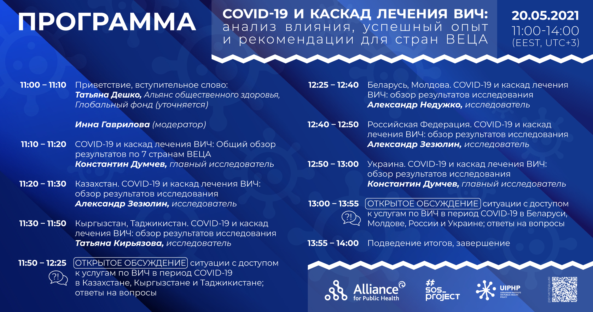 В обязательную программу входит презентация  аналитического отчета, посвященного теме исследования 2021-го года:  «Оценки динамики тестирования на ВИЧ и вовлечения людей, живущих с ВИЧ, в программы АРВ-терапии в регионе ВЕЦА». Это уже третья онлайн-дискуссия из серии мероприятий по изучению опыта противодействия COVID-19 в странах трех субрегионов: Восточной Европы, Центральной Азии и Юго-Восточной Европы.