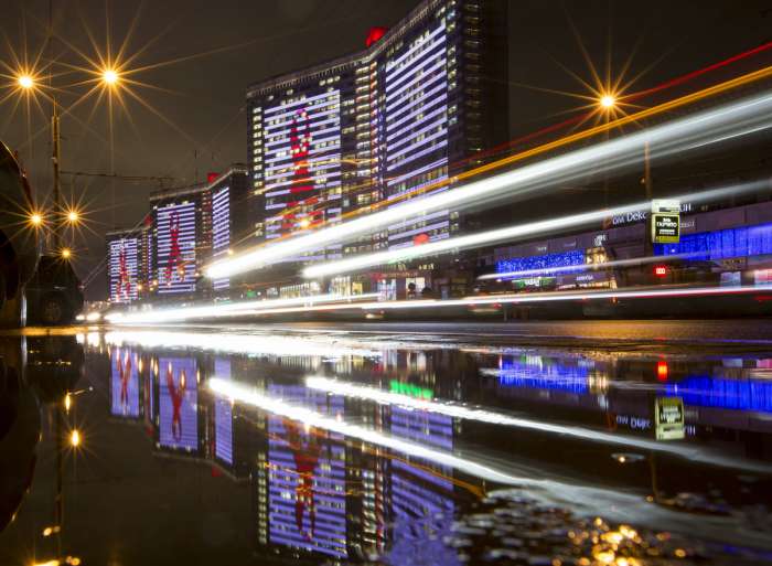 В международный День борьбы со СПИДом 1 декабря 2015 года красные ленты высветились на домах-книжках на Новом Арбате в Москве.
