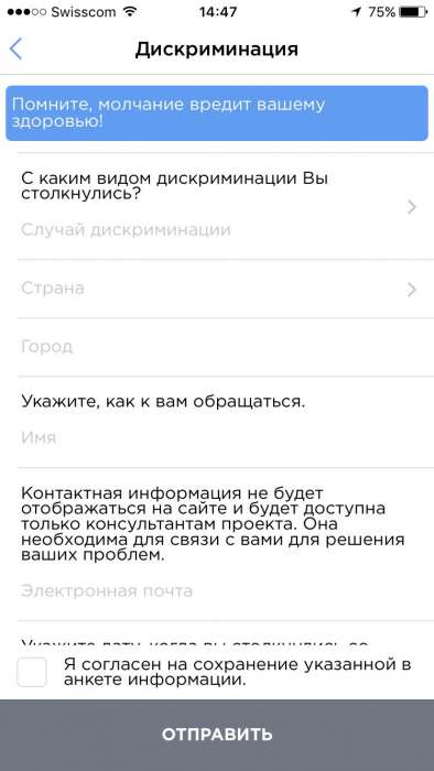Вышло новое обновление Приложения Life4me+, и теперь любой пользователь приложения может сообщить о случае дискриминации по отношению к нему как к ВИЧ положительному. Функцию «Дискриминация» легко найти, нажав на три точки в верхнем правом углу в личном кабинете. Чем детальнее Вы опишите случай дискриминации и укажите как с Вами связаться, тем больше шансов у нас на адвокацию и победу на дискриминацией. Помните, молчание вредит Вашему здоровью!