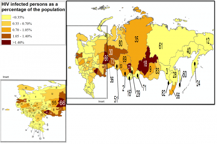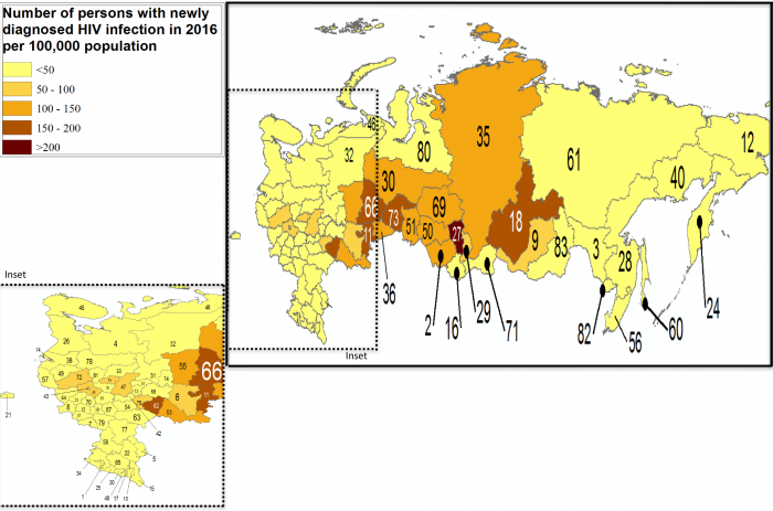 На рисунке 1 показана общая заболеваемость ВИЧ в 2016 году на каждые 100 тыс. населения в каждом субъекте РФ. Рисунок 2 демонстрирует ежегодную заболеваемость ВИЧ-инфекцией на каждые 100 тыс. населения на 2016 год. Заболеваемость ВИЧ-инфекцией распределена по стране неравномерно. Самая высокая заболеваемость отмечается в Кемеровской области и на юге Западной Сибири, где насчитывается 228,8 новых случаев заболевания на каждые 100 тыс. человек. К регионам с самой низкой заболеваемостью относятся Республика Калмыкия и Республика Тыва, граничащая с Монголией. Количество новых случаев заболевания в этих регионах составляет всего 5 на 100 тыс. человек. В десятку регионов с наиболее высоким числом новых случаев заболевания ВИЧ входит крупная территориальная группа из шести субъектов РФ в Восточной и Западной Сибири. Регионы данной группы граничат друг с другом. Самая высокая заболеваемость отмечается в Кемеровской области, далее следует соседняя Иркутская область, в которой число новых случаев заболевания насчитывает 163,6/100 000 чел; статистика для Тюменской области показывает 150,5/100 000 чел, для Томской области — 138/100 000 чел, для Новосибирской — 137,1/100 000 чел и для Красноярского края — 129,5/100 000 чел. Данный регион располагается к северу от Казахстана, и через него проходит главный наземный маршрут трафика героина и опиоидов из Афганиста — самого крупного производителя запрещенных опиоидов в мире в 2016 году. Афганистан располагается южнее шести вышеупомянутых субъектов РФ. Запрещенные опиоиды также поставляются в РФ из Афганистана по маршруту, проходящему через страны Балканского полуострова, откуда наркотики попадают в юго-западную часть страны.