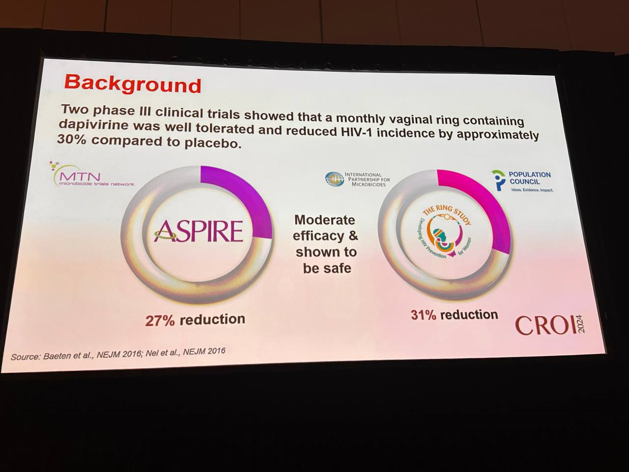 На панельной сессии были представлены данные III фазы клинических исследований кольца (ASPIRE, HOPE, DREAM, REACH, DELIVER, B-PROTECTED), в которых приняли участие в общей сложности 4 279 женщин из нескольких африканских стран к югу от Сахары. Результаты работы показали, что ежемесячное использование кольца, содержащего дипивирин, хорошо переносится и снижает вероятность инфицирования примерно на 30% в сравнении с плацебо.
