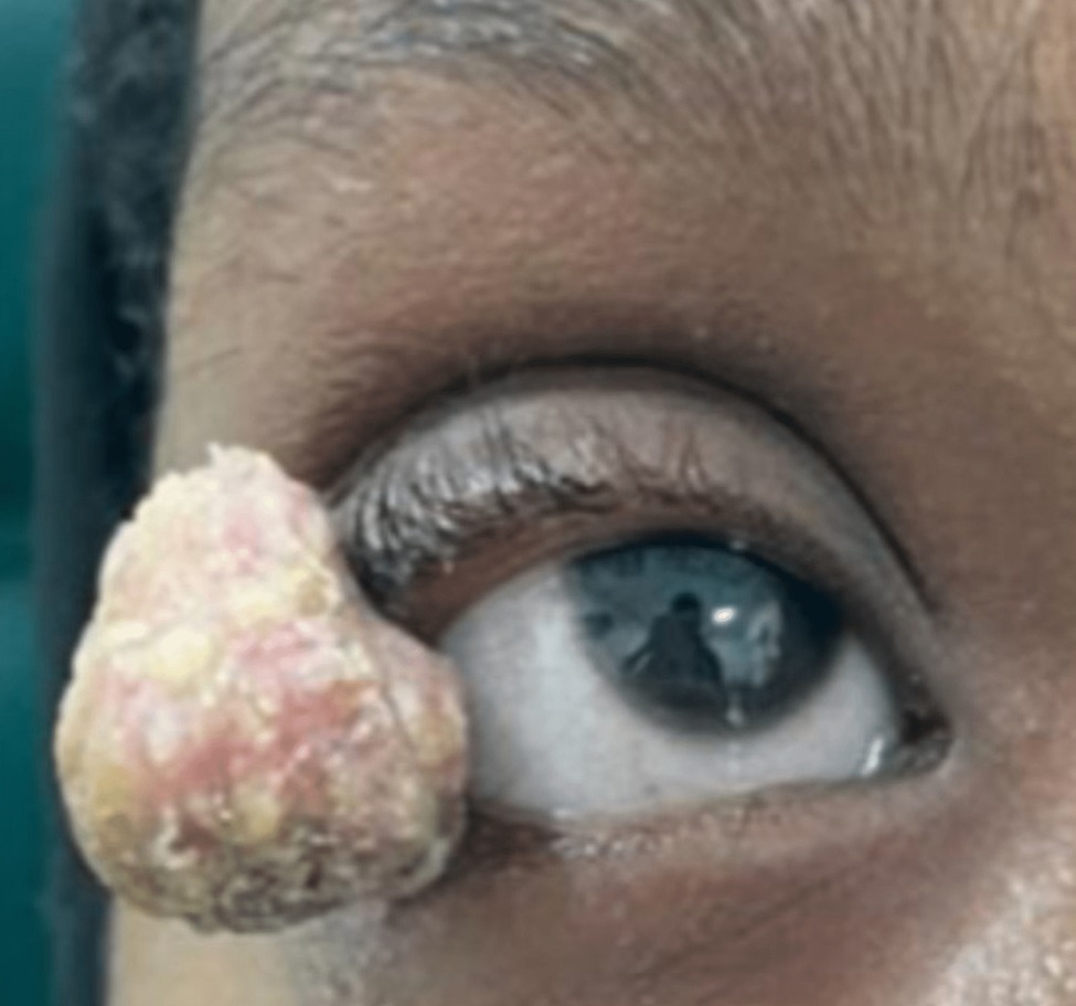 16-летняя девушка обратилась в больницу с большой «шишкой» на правом верхнем веке, которая мешала ей видеть. Врачи установили, что данное новообразование является контагиозным моллюском. Причём оно было необычно большого размера – 1,5 см в диаметре (стандартный размер КМ 1-5 мм).