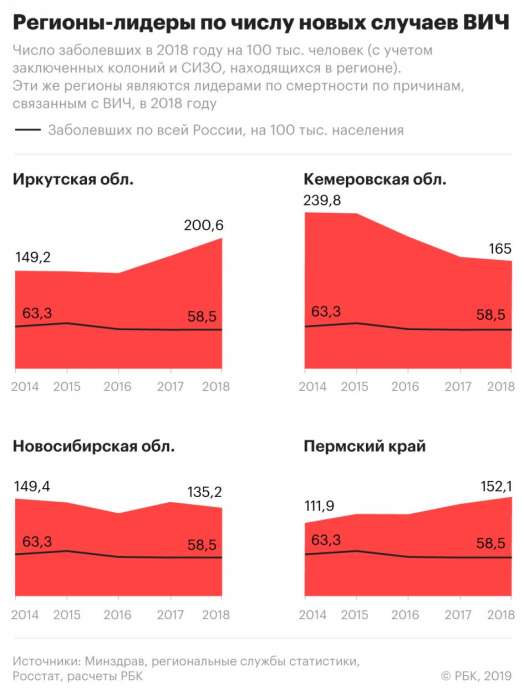 В четверку лидеров по показателю смертности от ВИЧ вошли Иркутская (рост на 16% по сравнению с 2017 г.), Кемеровская области, Пермский край и Новосибирская область.