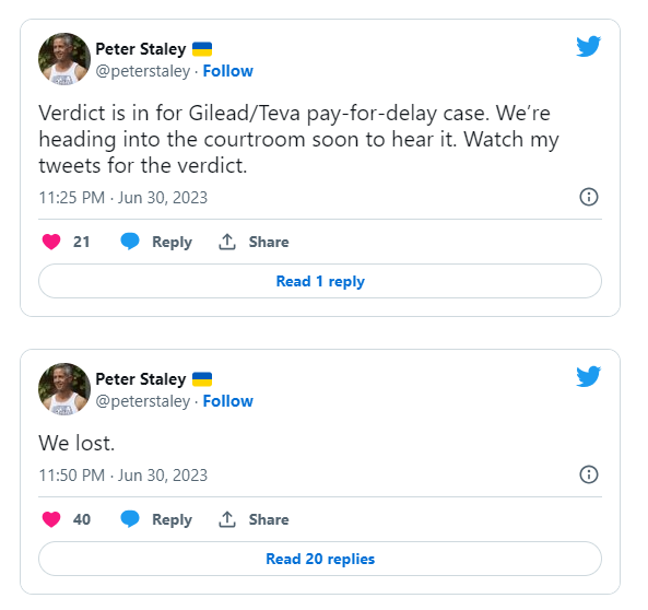 «Вынесен вердикт по делу Gilead/Teva о компенсации за задержку, — написал 30 июня в Twitter активист Питер Стейли. — Мы скоро отправимся в зал суда, чтобы его услышать. Следите за моими твитами, чтобы узнать решение».