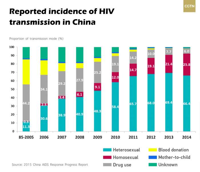 Технический директор китайского офиса Всемирной организации здравоохранения (ВОЗ) д-р Чжундан Чен (Zhongdan Chen), заявил, что ежегодные показатели новых случаев ВИЧ в Китае среди людей в возрасте от 15 до 19 лет выросли в период между 2008 и 2017 годами почти в три раза.