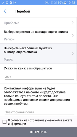 1. Каждый человек, использующий Life4me+ на территории России, теперь сможет воспользоваться функцией «Перебои», находящейся в правой части верхней панели приложения. Для перехода необходимо лишь выбрать нужный пункт контекстного меню, нажав на кнопку в правом верхнем углу основного экрана приложения, где у вас также есть возможность отправить нам сообщение-отзыв. Важный момент – функция доступна лишь для тех, кто при регистрации в качестве страны местонахождения указал Российскую Федерацию.