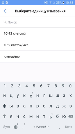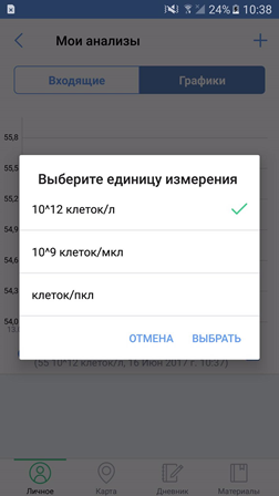 • выбирать единицы измерения показателей анализов для отображения их на графике;
