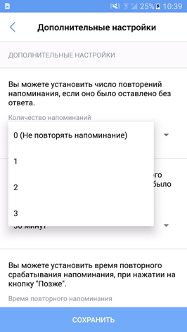 1. Разработчиками добавлена возможность отключения повторных напоминаний о приеме медикаментов. Теперь напоминания, которые пользователь игнорирует, можно будет отключить. Для этого нужно лишь в «Дополнительных настройках» к «Напоминаниям» (функция расположена в «Общих настройках») в пункте числа повторений поставить значение «0 (Не повторять напоминание)».