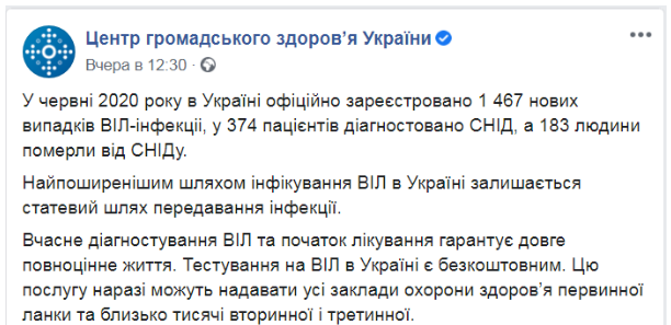 Центр общественного здоровья Минздрава Украины (ЦОЗ) в это воскресенье опубликовал последние данные по заболеваемости ВИЧ-инфекцией в стране и призвал людей чаще проходить диагностику.