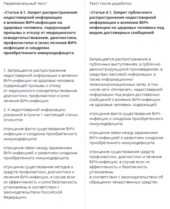 4 сентября Министерство здравоохранения РФ разместило на Едином портале проектов нормативных правовых актов финальную редакцию текста Федерального закона «О внесении изменения в Федеральный закон “О предупреждении распространения в Российской Федерации заболевания, вызываемого вирусом иммунодефицита человека (ВИЧ-инфекции)” в части установления запрета распространения недостоверной информации о влиянии ВИЧ-инфекции на здоровье человека».
