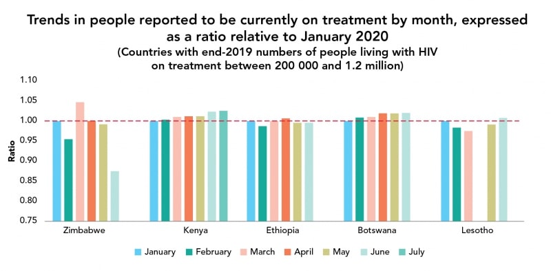 Влияние COVID-19 на услуги по лечению ВИЧ рассчитывалось в отношении к январю: например, если в апреле количество людей, проходящих лечение, было таким же, как в январе, отношение составляло 1; если наблюдалось снижение, то это число было меньше 1.