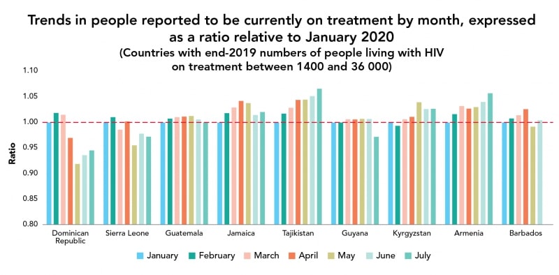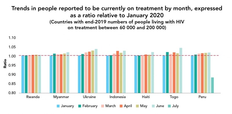 Практически все страны показали снижение новых обращений за АРВТ на один месяц и более по сравнению с январем. Пять стран сообщили о ежемесячном снижении числа людей, проходящих лечение после апреля, это Зимбабве, Перу, Гайана, Доминиканская Республика и Сьерра-Леоне. В остальных 18 странах снижения не наблюдалось, а в некоторых даже происходил устойчивый рост. В их числе - Кения, Украина, Того и Таджикистан.